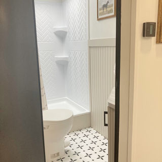 The bathroom features a beautiful bead board wall and stylish tile floor. It boasts a large shower.